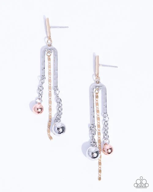 Featuring a delicately hammered finish, a rectangular vertical gold fitting gives way to an unfinished hammered silver cylindrical frame. Silver and shiny copper beads cascade from the ends of the unfinished frame in varying lengths while a dainty textured gold chain sways from the middle of the frame for a tapered, trailblazing lure. Earring attaches to a standard post fitting. Paparazzi Accessories