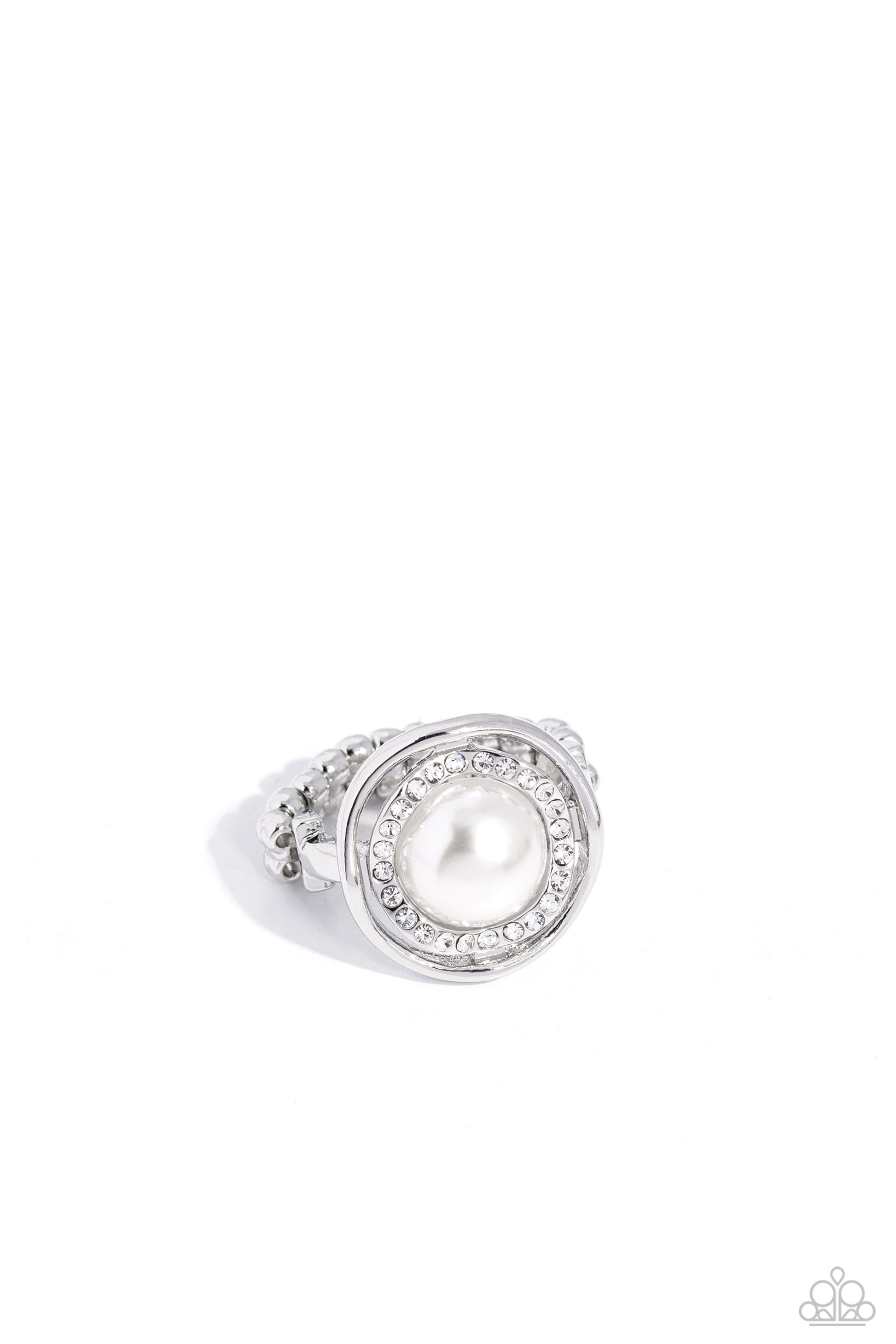 A slightly warped silver hoop encircles a glossy white pearl atop a dainty silver band. A daintier warped silver hoop, encrusted with white rhinestones, curls around the pearl inside the larger silver hoop for a touch of glitz to the sophisticated centerpiece. Features a dainty stretchy band for a flexible fit. Sold as one individual ring.