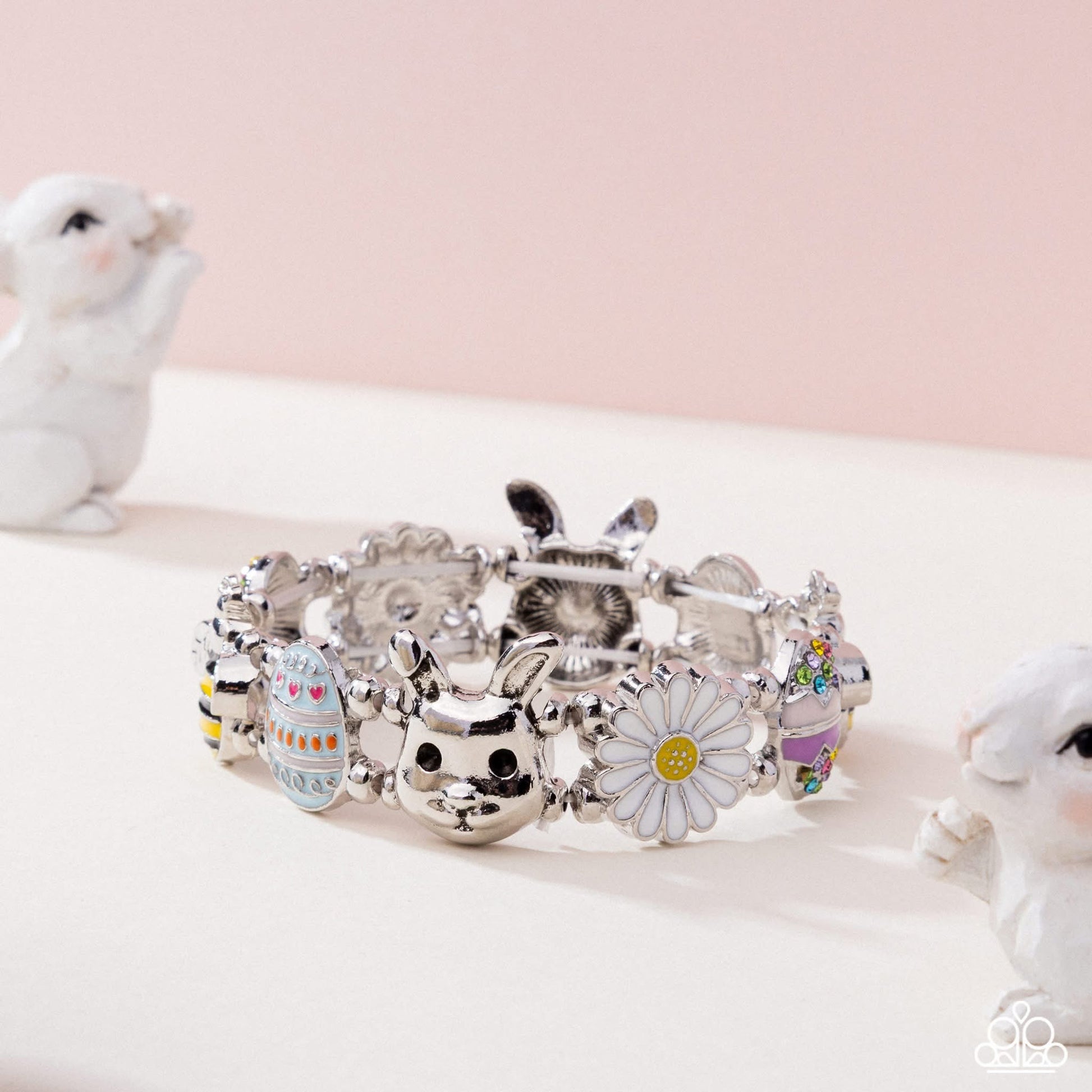 Infused along elastic stretchy bands, a collection of Easter-inspired charms including various multicolored Easter eggs with multicolored rhinestones, silver bees, bunny heads, and daisies encircles the wrist separated by stacked silver beads for an eclectic pop of eye-catching whimsy and color. Paparazzi Accessories