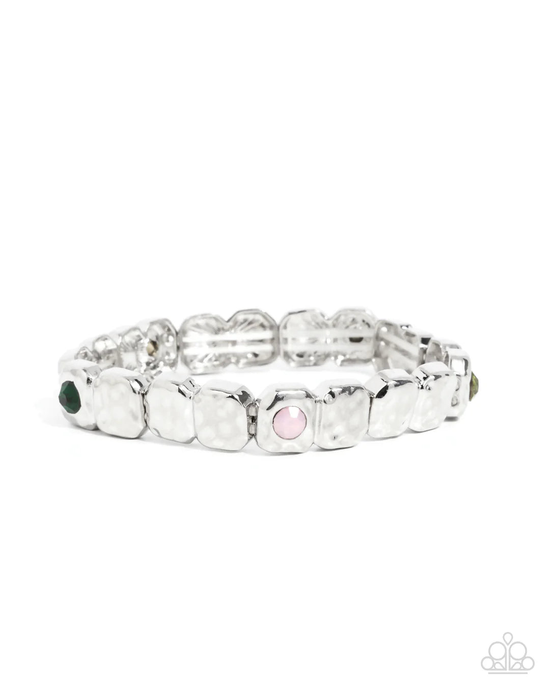 Infused along elastic stretchy bands, a collection of rounded, hammered silver squares is dotted with multicolored, opalescent, and iridescent rhinestones, creating a twinkly, textured look. Due to its prismatic palette, color may vary. Paparazzi Accessories