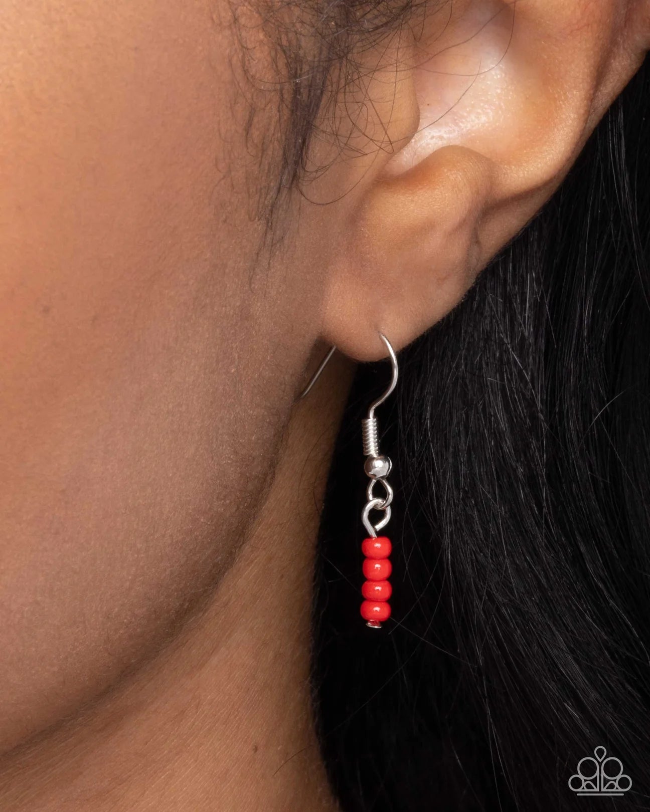 Infused along an invisible string, glossy red seed beads loop below the neckline, coalescing into a feminine bow that curls around a silver bead center with additional silver beads capping the ends of the design for a sleek finish. Features an adjustable clasp closure.