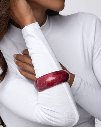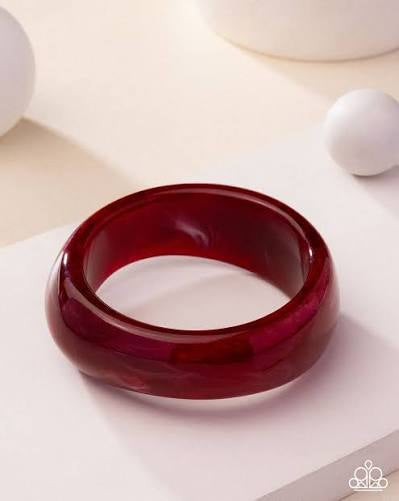 Featuring a mesmerizing swirled motif, a dramatically oversized red acrylic bangle slides along the wrist for a trendy pop of color.