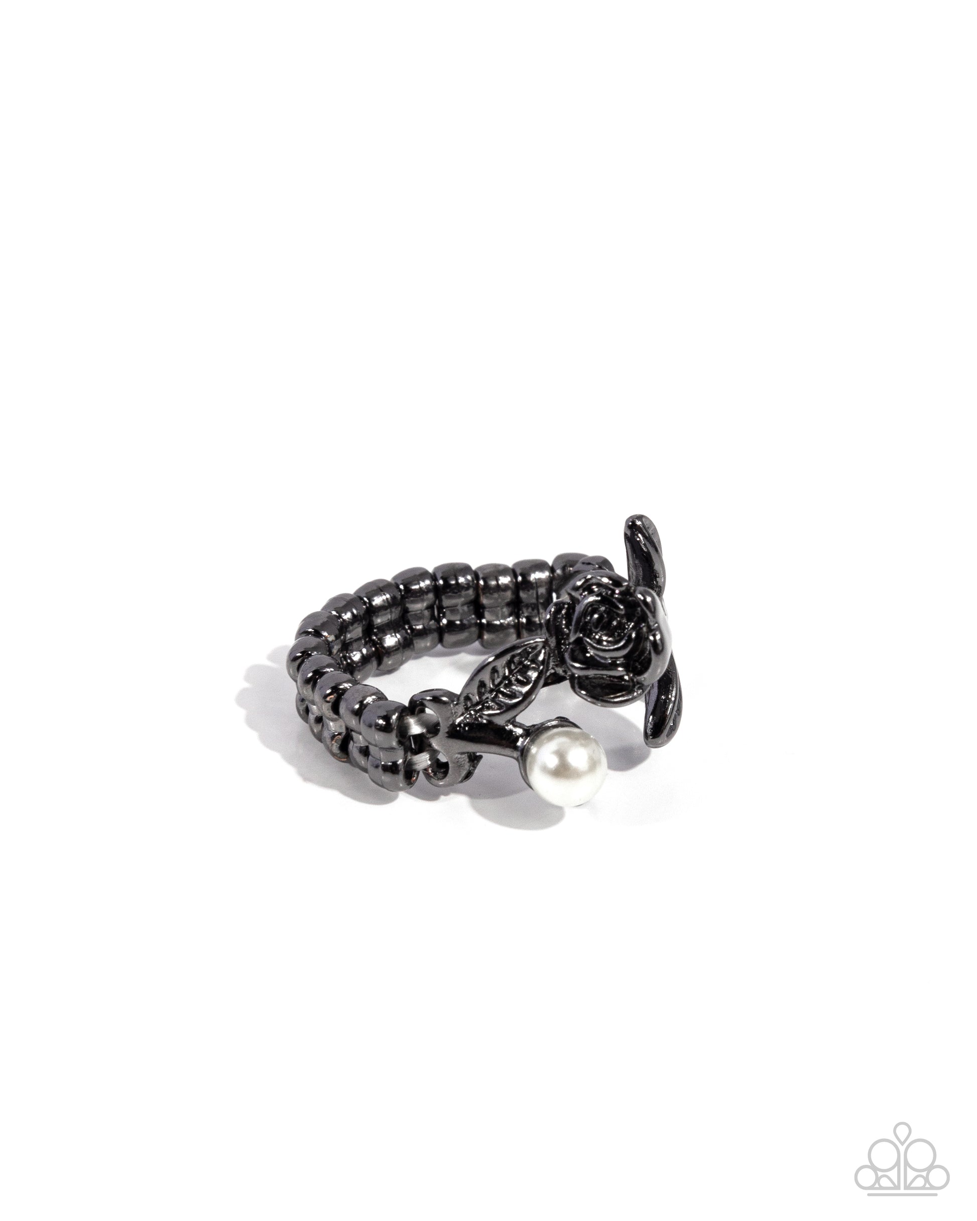 Blooming from the stem of a sleek gunmetal rose, a glossy white pearl curls around the finger for a whimsically refined centerpiece. Features a dainty stretchy band for a flexible fit. Paparazzi Accessories