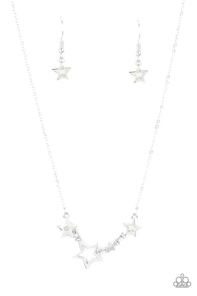 A mismatched collection of airy silver stars and white rhinestone dotted star frames delicately link below the collar, creating a stellar patriotic inspired pendant. Features an adjustable clasp closure. Paparazzi Accessories