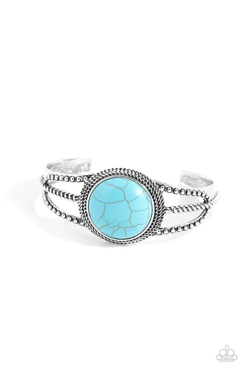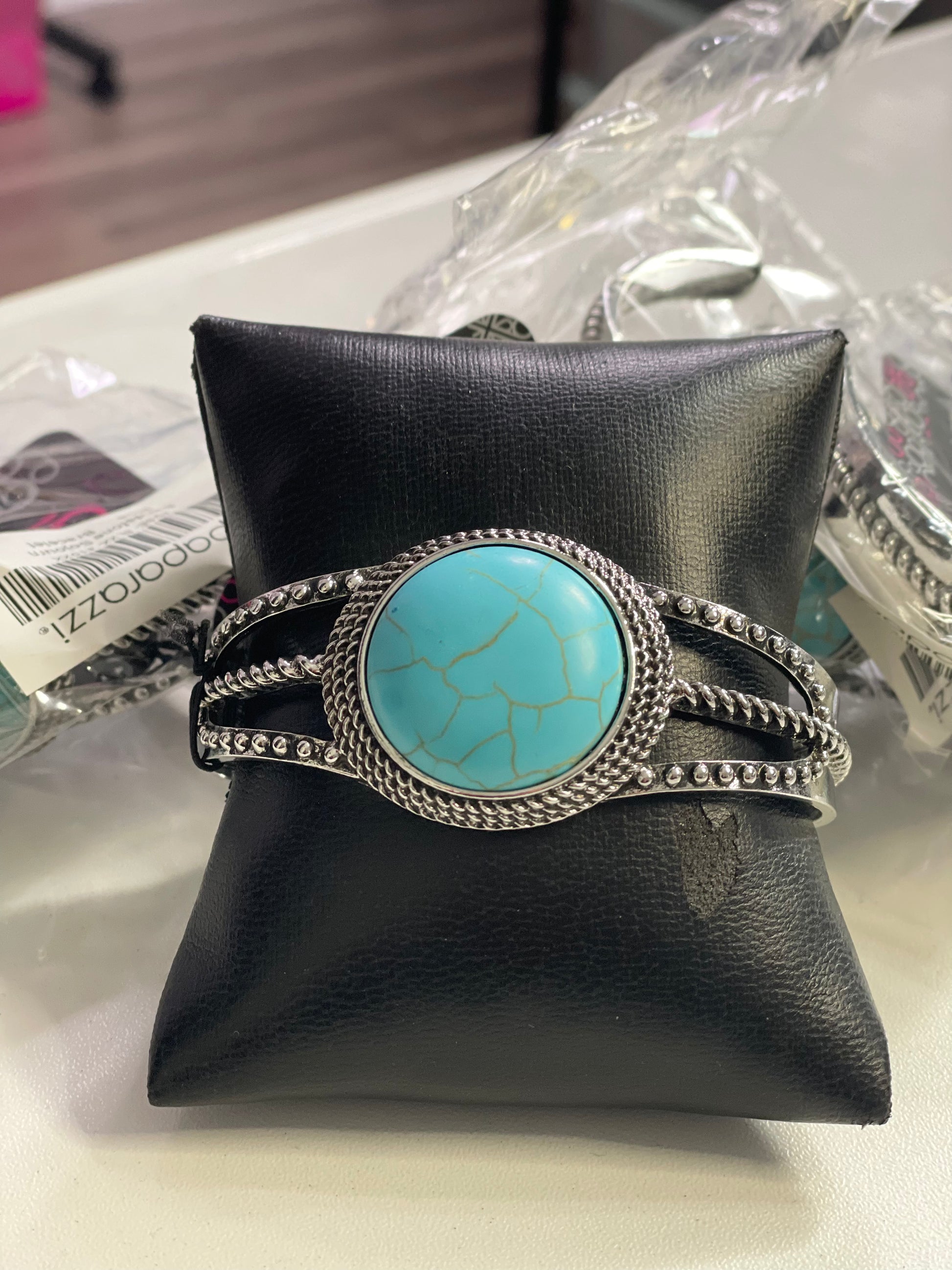 An oversized turquoise stone is pressed into the center of a ropy textured frame set atop layers of twisted and studded silver bars, stacking into a rustic cuff around the wrist.