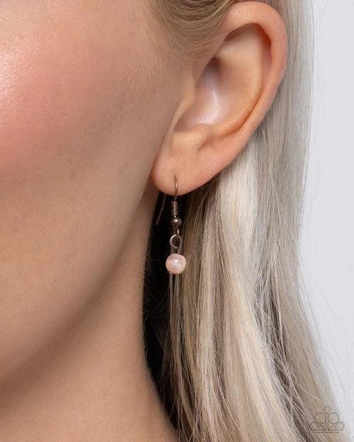 Infused along an invisible string, a collection of cloudy light peach acrylic beads cascades below the neckline. Featuring a stamped floral motif, a textured copper heart pendant is suspended below a peach string bow that sways below the peachy beaded chain for a flourishing, whimsical finish. Features an adjustable clasp closure. Paparazzi Accessories